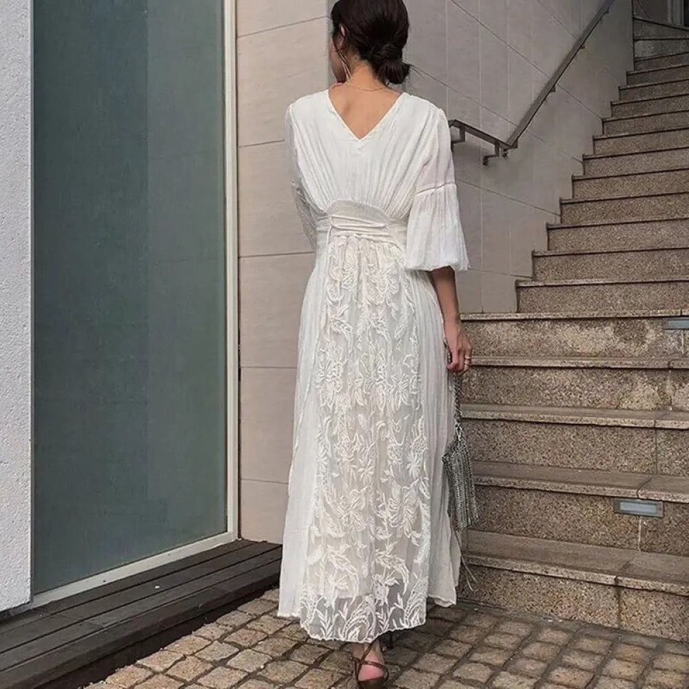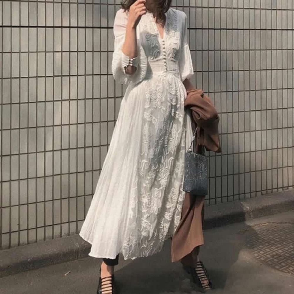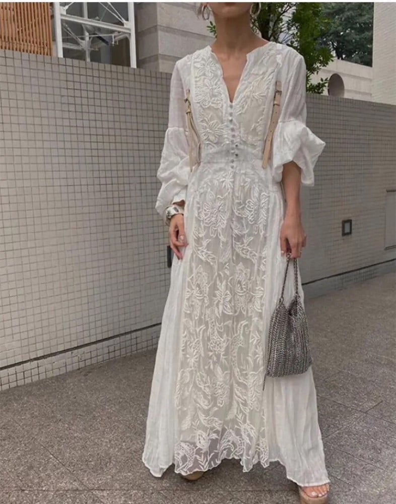 مواصفات فستان أبيض مطرز بأكمام طويلة: