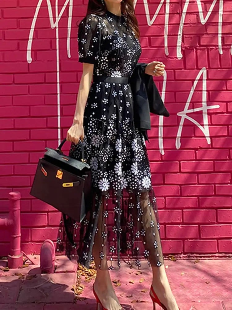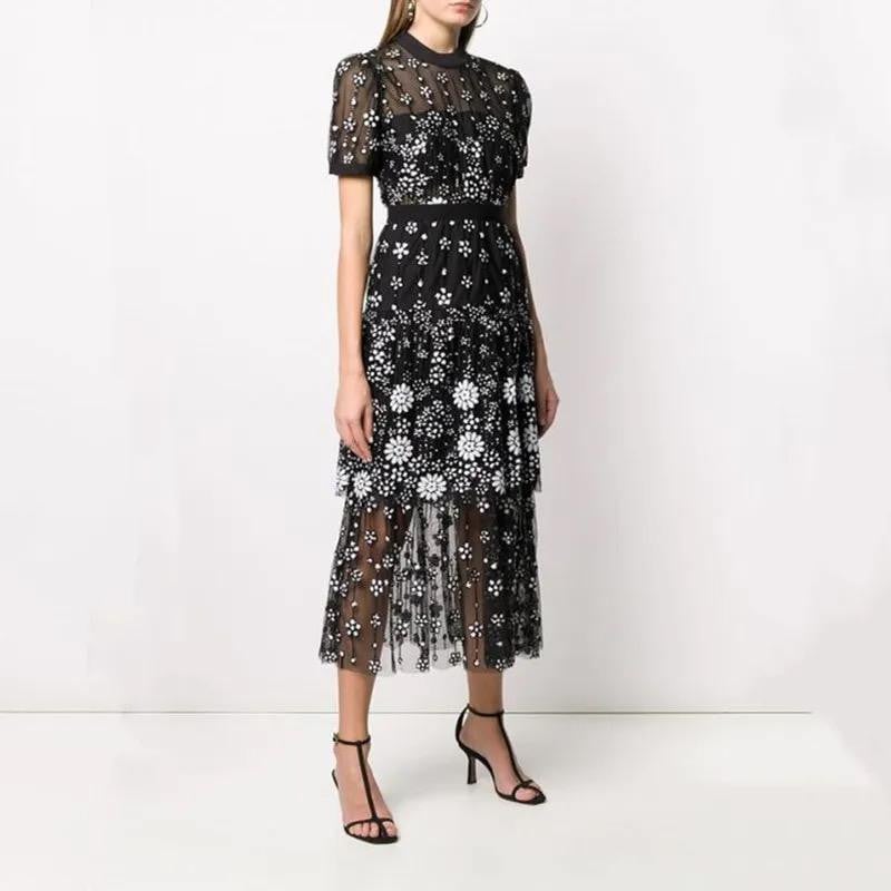 • التصميم: فستان بأكمام قصيرة بتطريز دقيق يتناغم مع اللون الأسود ليمنحكِ إطلالة أنثوية متكاملة.