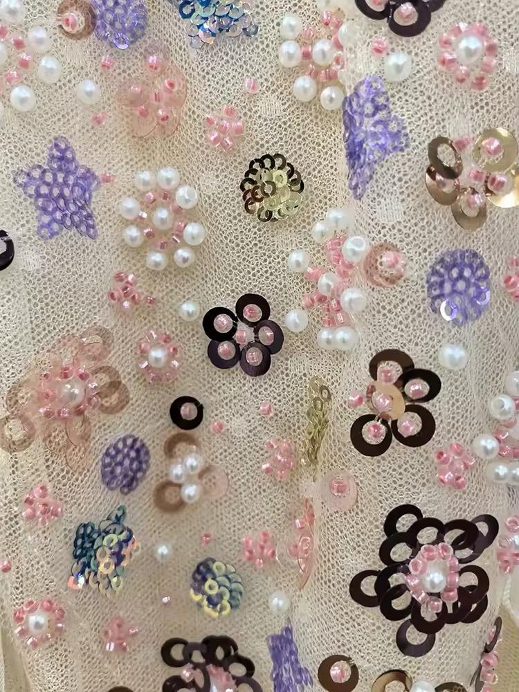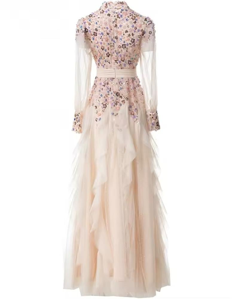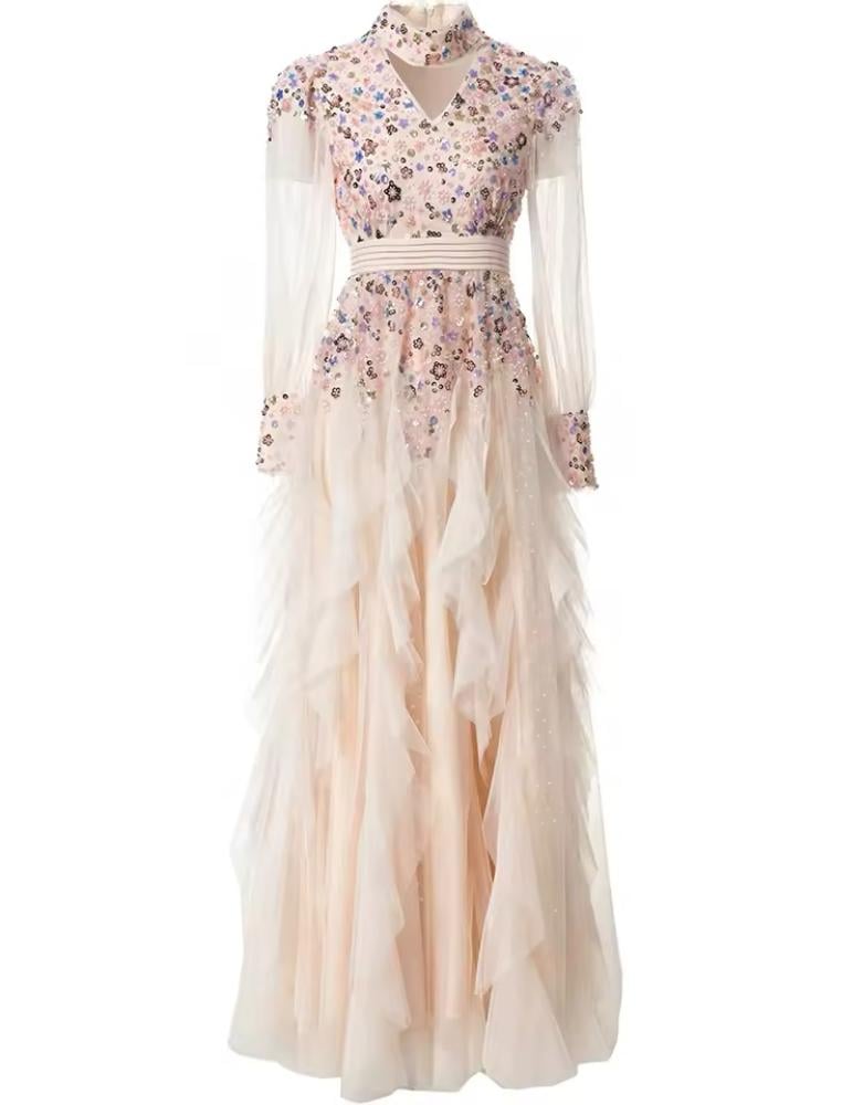 فستان طبقات من التل طويل بأكمام طويله مميزة وقصة صدر أنيقة