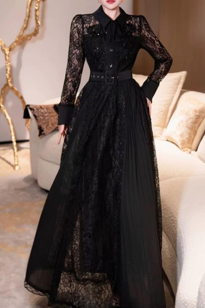فستان فخم دانتيل اسود مبطن طويل بكم طويل مع حزام أنيق