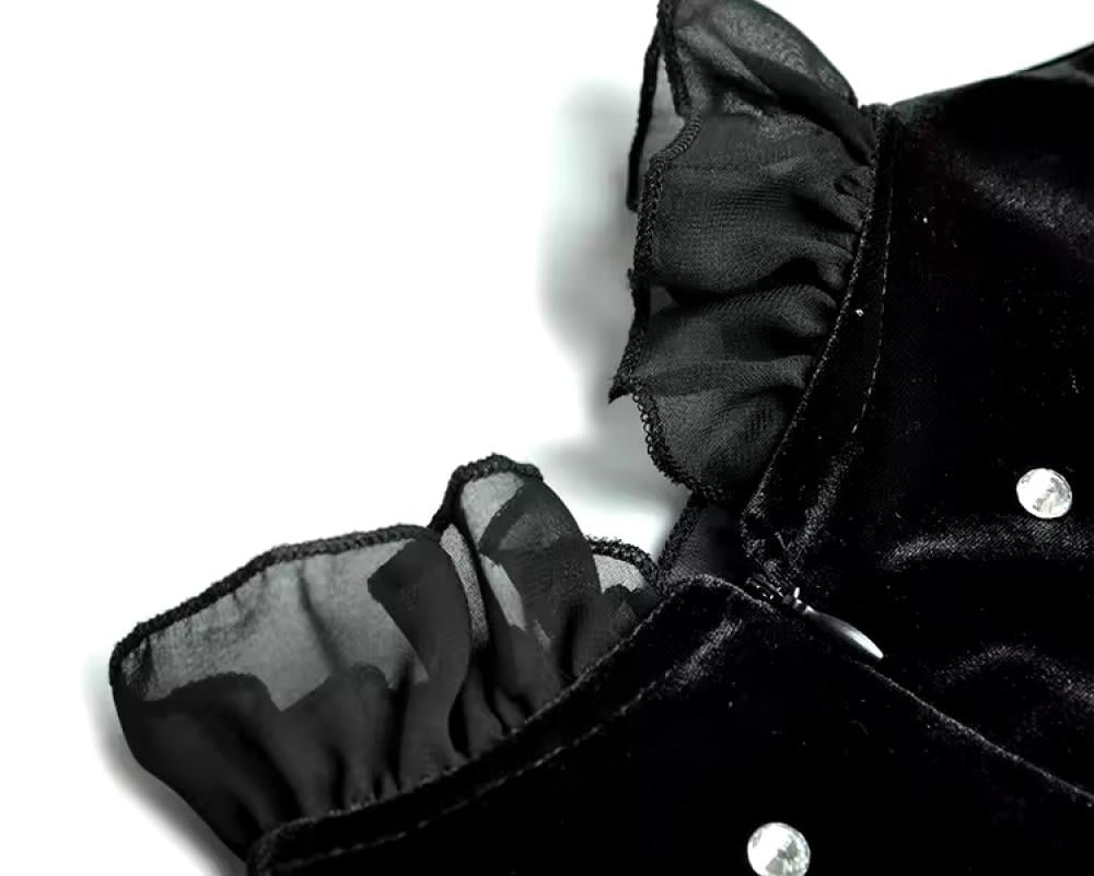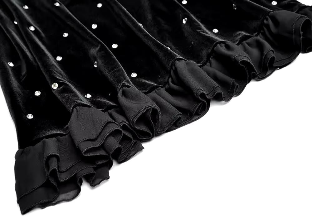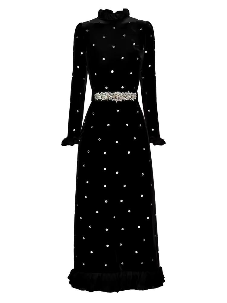 فستان مخملي اسود مزين بالكريستال الفضي وأطراف مميزة مع الحزام
