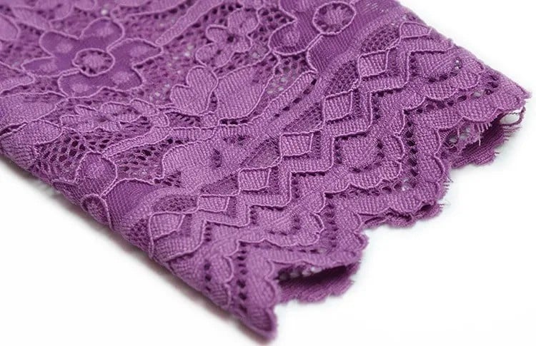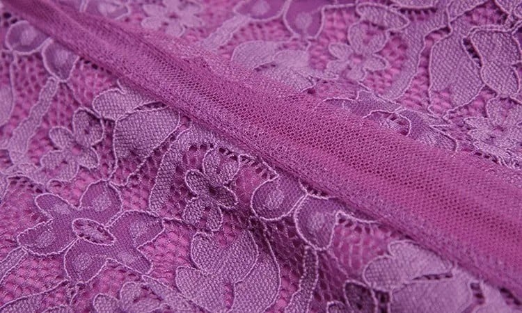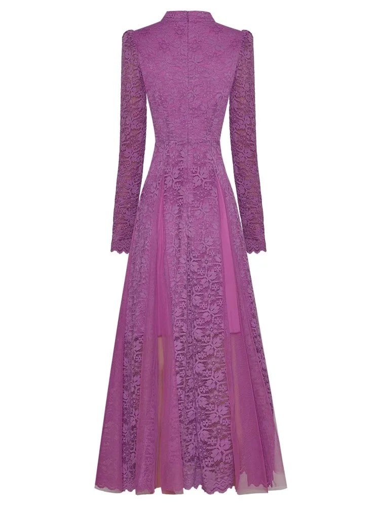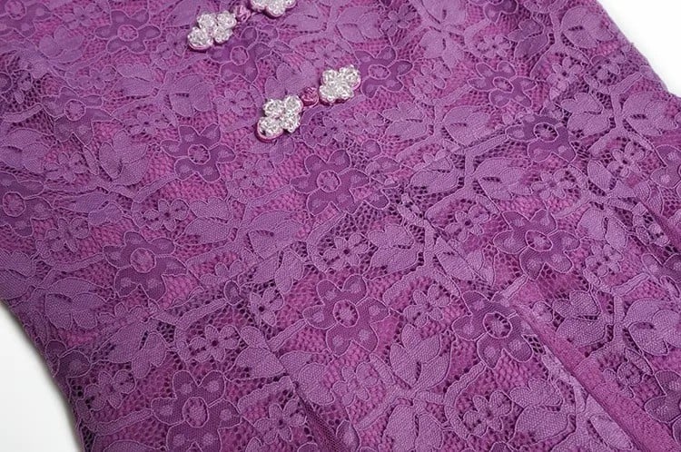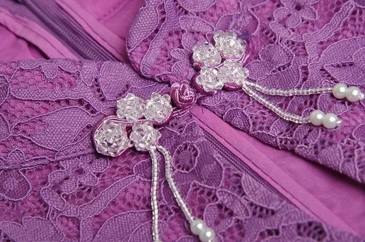 فستان بنفسجي دانتيل مع التل طويل، وقطع الكِريستال