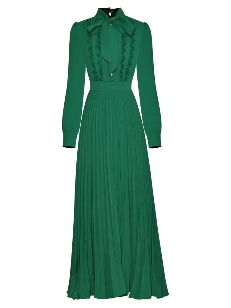 - التصميم: فستان مكسر بأكمام طويلة مع قطع من الدانتيل.